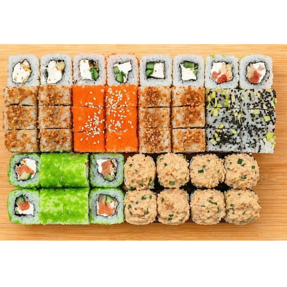 Калифорния, Снэк ролл, Сливочный лосось, Карри ролл, Витамин, Чикен спайс. (1122гр)