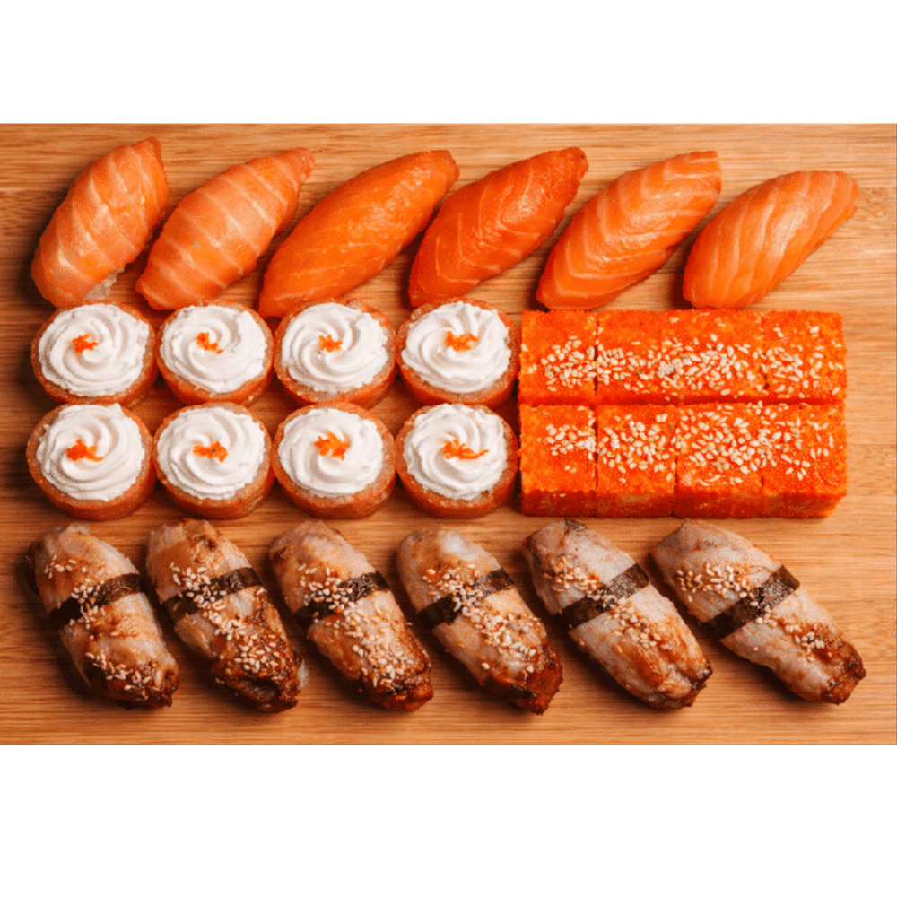 Ролл Калифорния с крабом, ролл Филадельфия дабл, суши с угрём, суши с лососем. (878гр)