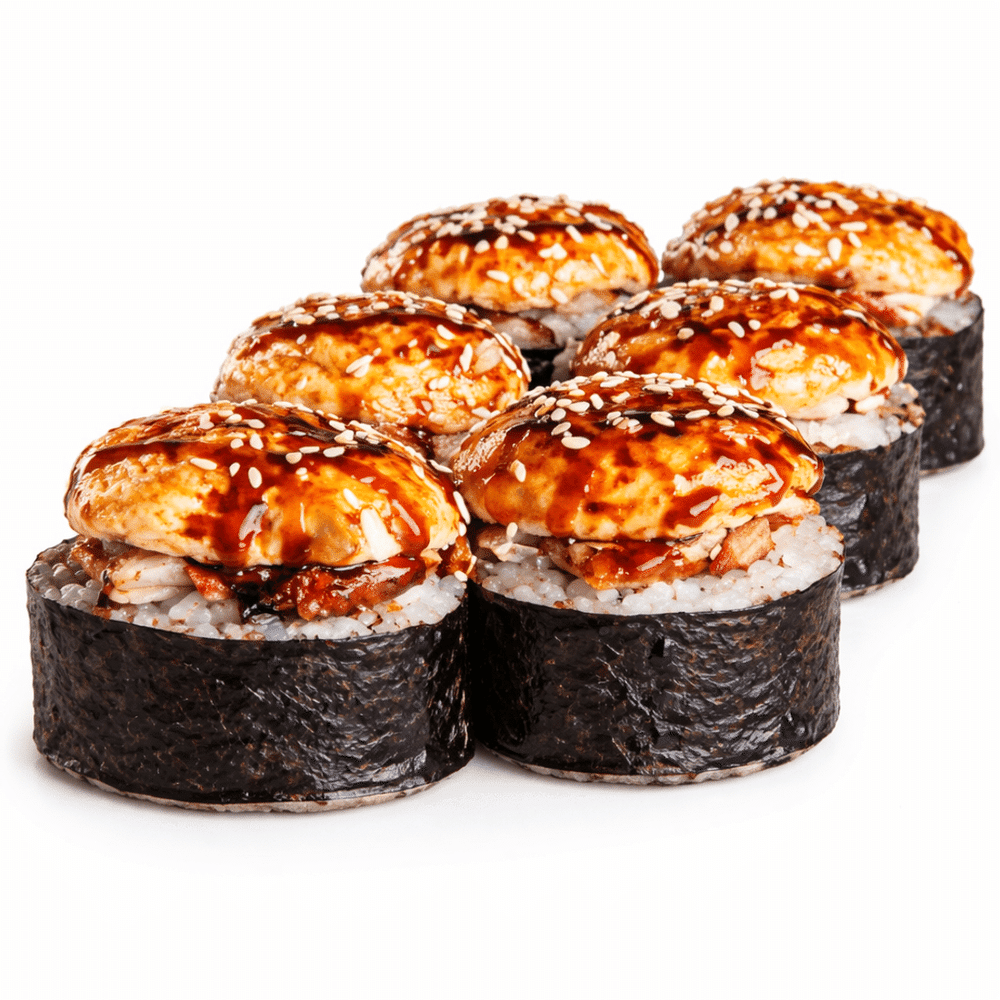 Лосось, угорь, соус розовый, авокадо, огурец, сливочный сыр, соус унаги, кунжут. (220гр)