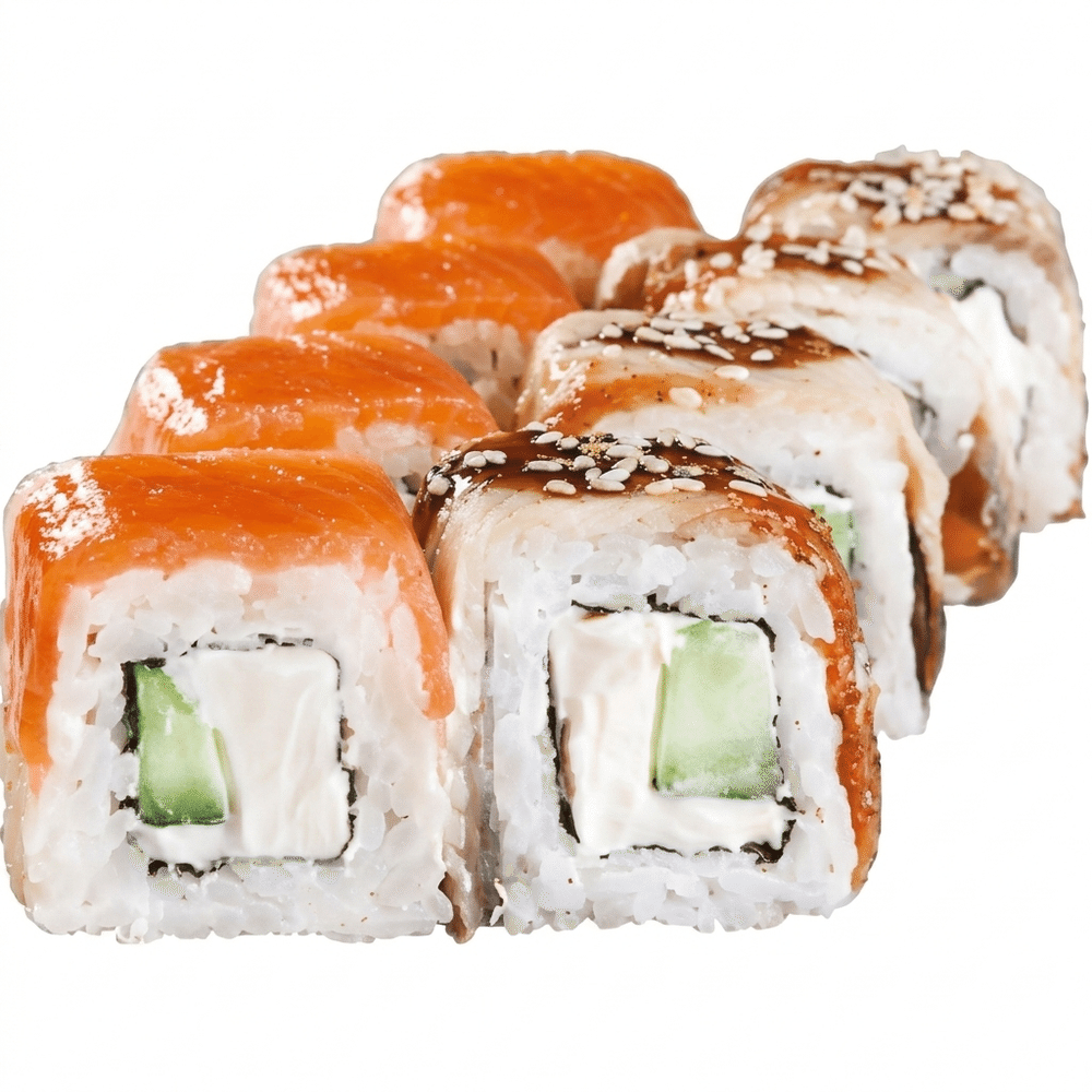 Лосось, угорь, сливочный сыр, огурец, краб, соус унаги, кунжут. (209гр)