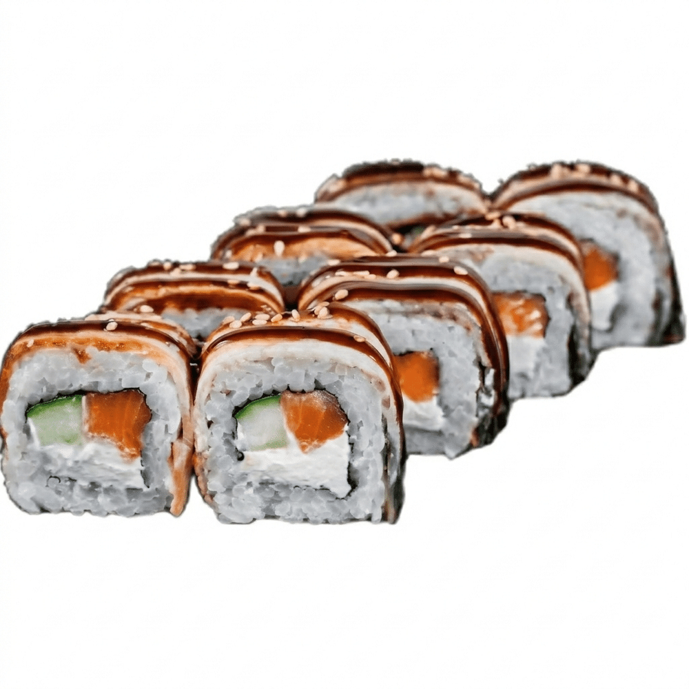 Угорь, сливочный сыр, лосось, огурец, соус унаги, кунжут. (215гр)