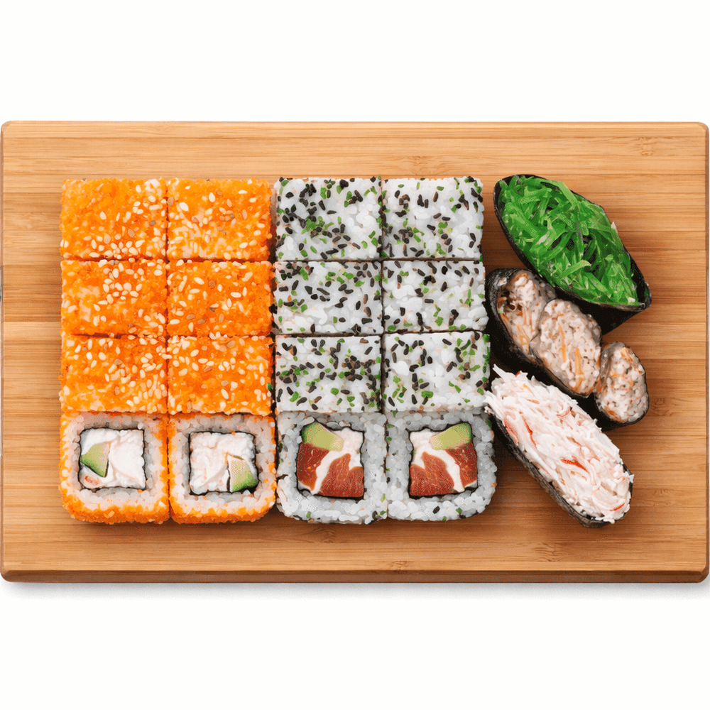 Калифорния, витамин, суши с чукой, суши с мидиями и ореховым соус, суши с крабом. (450гр)