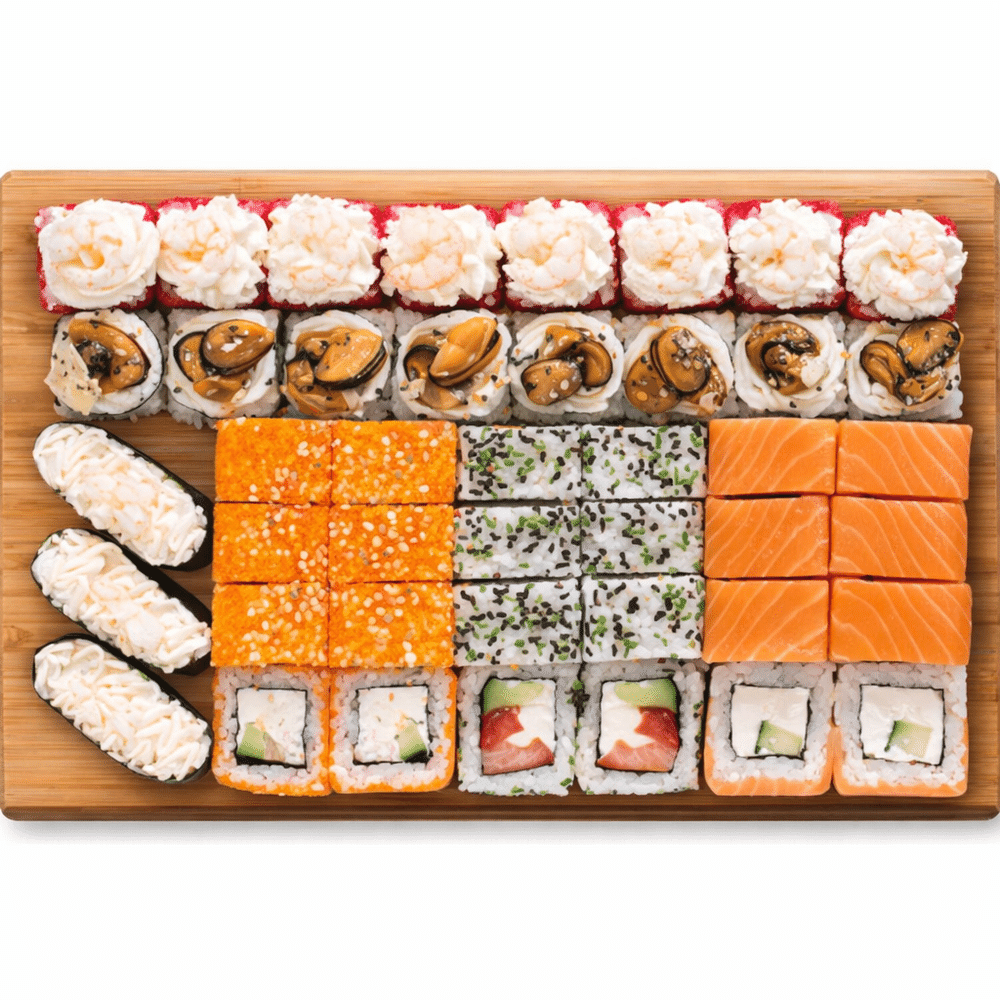 Филадельфия, Калифорния, Мидии терияки, Сливочная креветка, Витамин, 3 суши с креветкой и сливочным сыром. (1039гр)