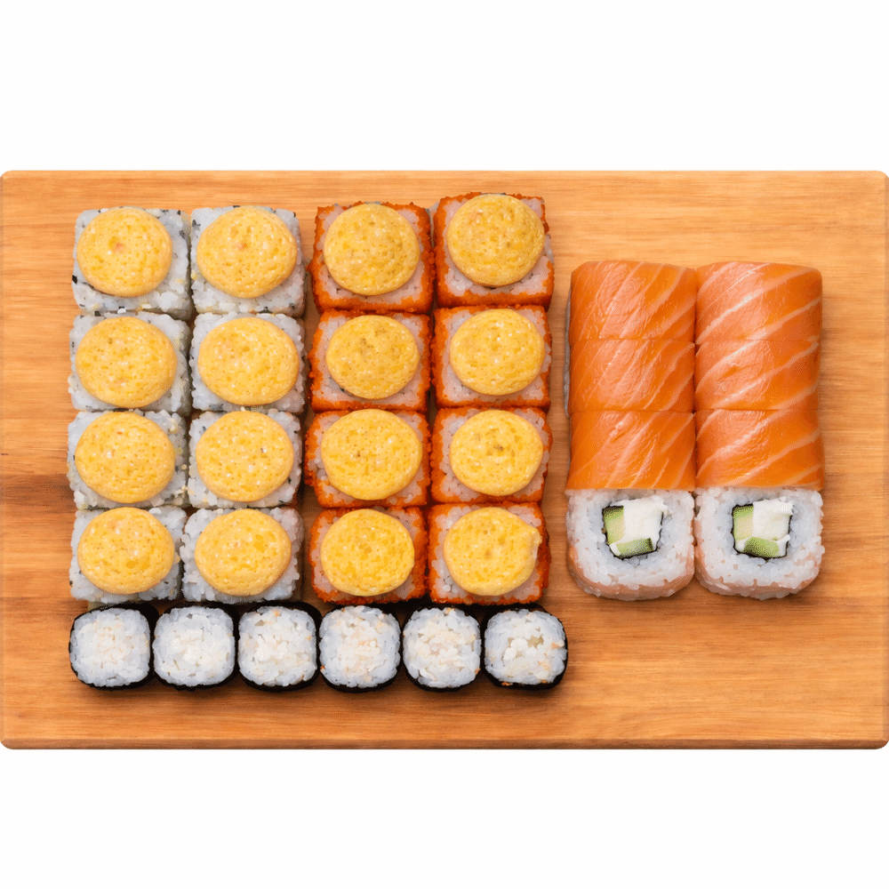 Филадельфия, Ролл с копченой курицей, Калифорния, Мини ролл Чикен Спайс, розовый соус. (684гр)