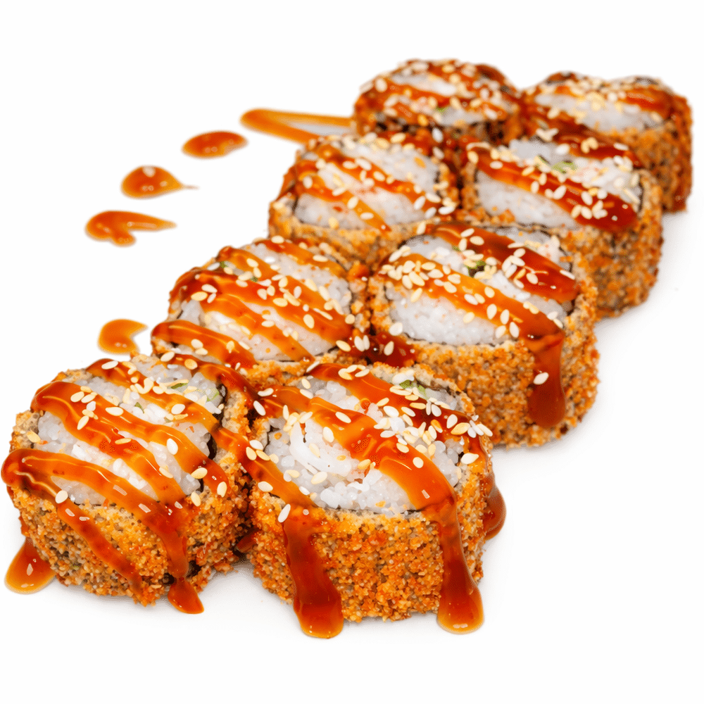 Тигровая креветка, снежный краб, сливочный сыр, соус унаги, кунжут. (233гр)