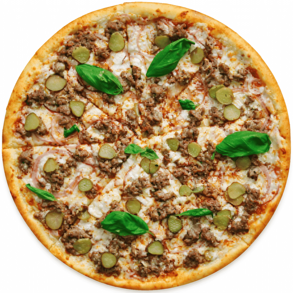 Фирменный соус, сыр моцарелла, фарш говяжий, лук красный, огурцы маринованные, свежий базилик.