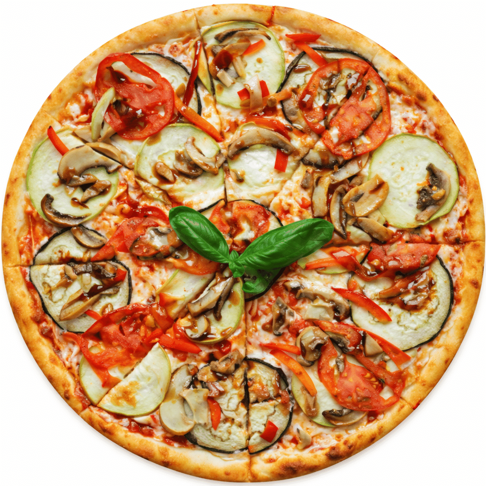 Фирменный соус, сыр моцарелла, томаты, баклажан, цукини, шампиньоны, перец болгарский, соус унаги, базилик свежий.