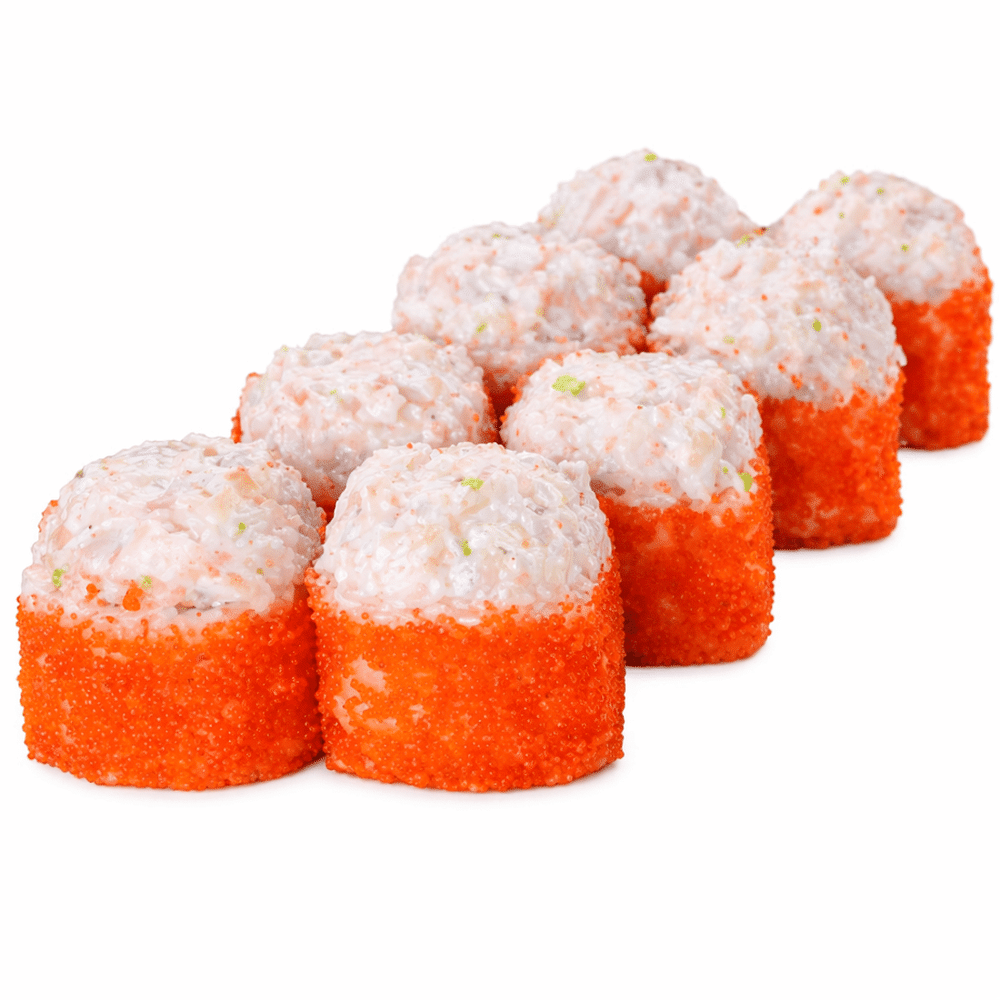 Креветки тигровые, сливочный сыр, огурец, икра масаго, соус спайси, лук зеленый. (210гр)