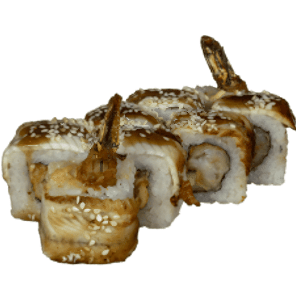 Креветка тигровая, соус спайси, огурец, угорь, соус унаги, кунжут. (260гр)